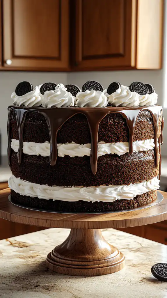 • Place final cake layer on top and finish with remaining whipped cream, ganache drizzle, and Oreo garnish.