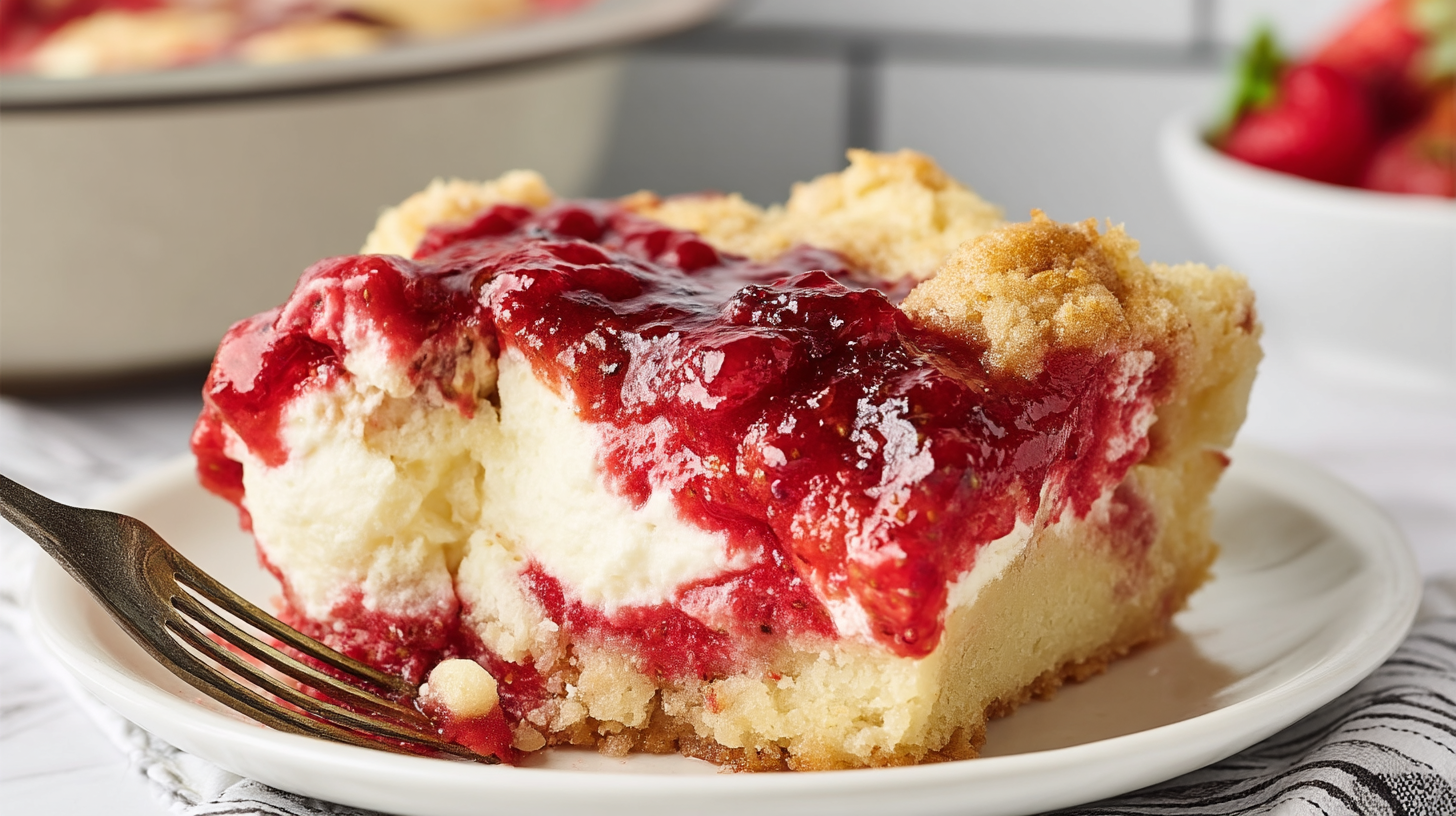 A show-stopping, no-mixer dump cake with a layered strawberry pie base, creamy cheesecake center, and golden vanilla cake topping. Effortlessly elegant for Mother’s Day.