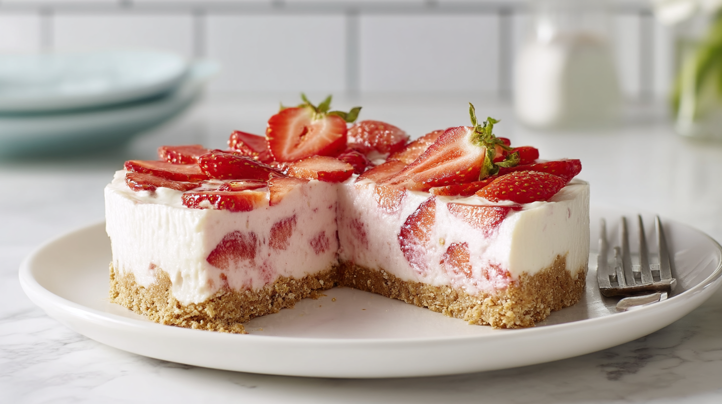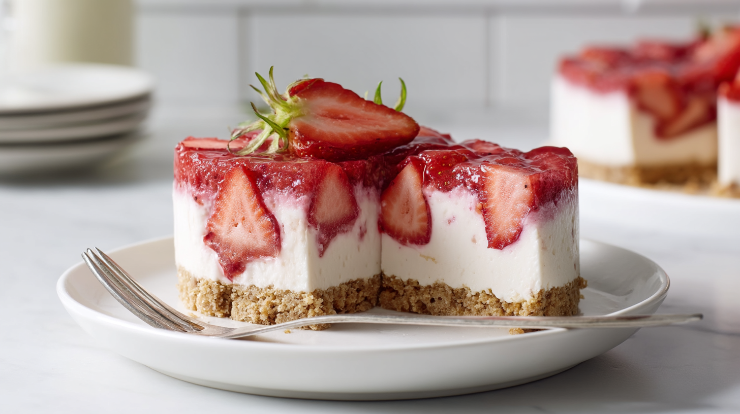 A chilled, no-bake dessert with a buttery graham cracker crust, creamy vanilla-infused cream cheese filling, and fresh strawberry topping. Perfect for summer gatherings or quick homemade luxury.