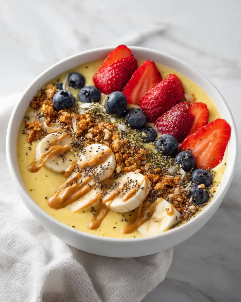Arrange your toppings in sections or rows for that Instagram-worthy look. I like to do berries on one side, granola on another, sliced banana, a drizzle of nut butter, and a sprinkle of seeds and coconut flakes. Get creative and make it your own.